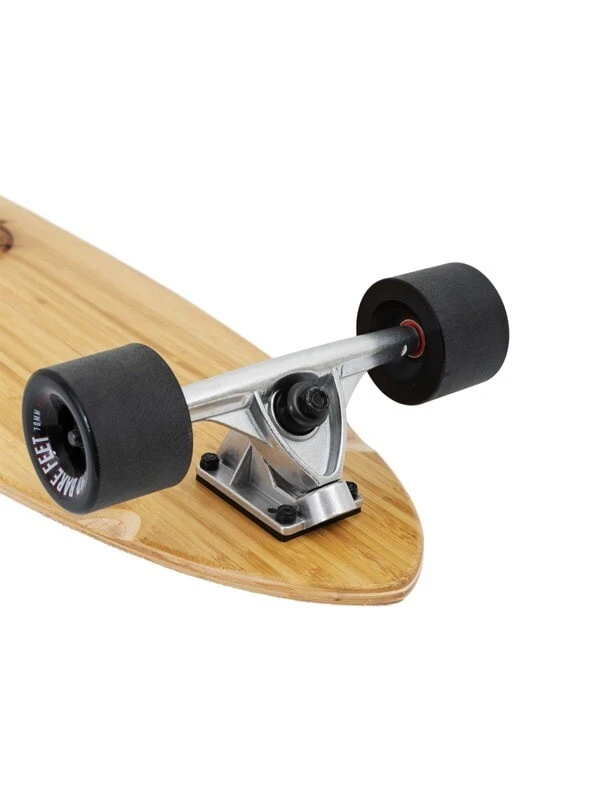 The Chuck is 44 inches long and 9.5 inches wide with a 33 inch wheelbase all wrapped up in a timeless shape that’s perfect for cruising and carving around town and hills. With a very mild concave deck that is on the narrow side, finding a groove with the Chuck is easy and the bamboo construction offers a medium amount of flex. This gives the board a good balance between straight line speed and lovely smooth, springy turns. This also takes the rough bumps and cracks you’ll encounter and smooths them down as you ride.