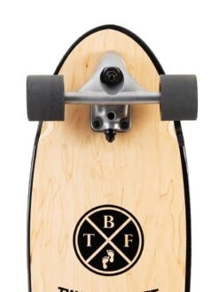 Undoubtedly though, the coolest part of the design is the Two Bare Feet Boarding Co hardware logo laser etched into the wood on the underside of the deck. On top you’ve got a retro influenced striped design over which a spray on clear grip runs the full length of the deck, which we reckon is more aesthetically pleasing than regular black grip tape but because it is crafted from recycled glass particles, the spray grip is a smart eco-friendly application too.